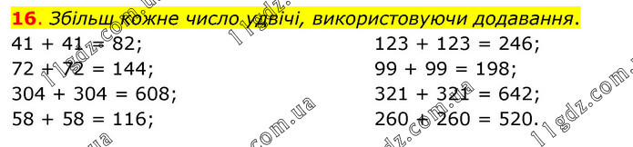 Збільш кожне число удвічі, використовуючи додавання. 41 + 41 = 82; 72 + 72 = 144; 304 + 304 = 608; 58 + 58 = 116; 123 + 123 = 246; 99 + 99 = 198; 321 + 321 = 642; 260 + 260 = 520.