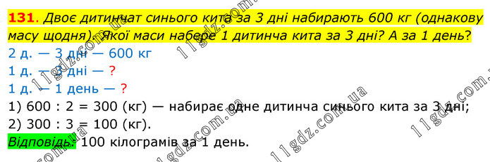 Двоє дитинчат синього кита за 3 дні набирають 600 кг (однакову масу щодня). Якої маси набере 1 дитинча кита за 3 дні? А за 1 день? 2 д. — 3 дні — 600 кг 1 д. — 3 дні — ? 1 д. — 1 день — ? 1) 600 : 2 = 300 (кг) — набирає одне дитинча синього кита за 3 дні; 2) 300 : 3 = 100 (кг). Відповідь: 100 кілограмів за 1 день.