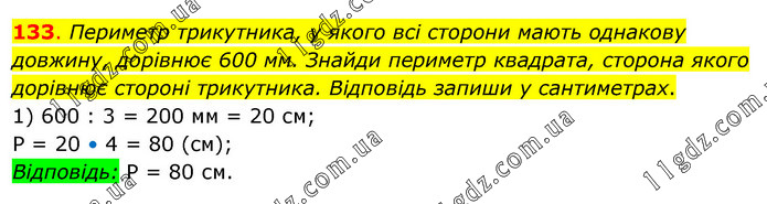 Периметр трикутника, у якого всі сторони мають однакову довжину, дорівнює 600 мм. Знайди периметр квадрата, сторона якого дорівнює стороні трикутника. Відповідь запиши у сантиметрах. 1) 600 : 3 = 200 мм = 20 см; Р = 20 • 4 = 80 (см); Відповідь: Р = 80 см.