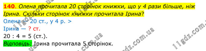 Олена прочитала 20 сторінок книжки, що у 4 рази більше, ніж Ірина. Скільки сторінок книжки прочитала Ірина? Олена — 20 ст., у 4 р. > Ірина — ? ст. 20 : 4 = 5 (ст.). Відповідь: Ірина прочитала 5 сторінок.