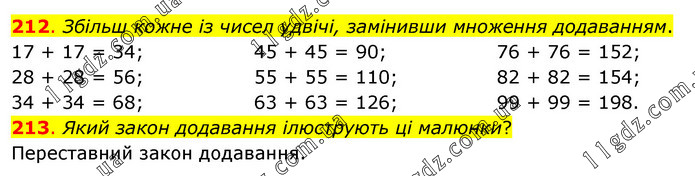212. Збільш кожне із чисел удвічі, замінивши множення додаванням. 17 + 17 = 34; 28 + 28 = 56; 34 + 34 = 68; 45 + 45 = 90; 55 + 55 = 110; 63 + 63 = 126; 76 + 76 = 152; 82 + 82 = 154; 99 + 99 = 198. 213. Який закон додавання ілюструють ці малюнки? Переставний закон додавання.
