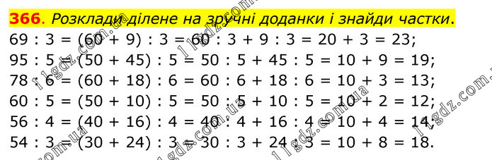 Розклади ділене на зручні доданки і знайди частки. 69 : 3 = (60 + 9) : 3 = 60 : 3 + 9 : 3 = 20 + 3 = 23; 95 : 5 = (50 + 45) : 5 = 50 : 5 + 45 : 5 = 10 + 9 = 19; 78 : 6 = (60 + 18) : 6 = 60 : 6 + 18 : 6 = 10 + 3 = 13; 60 : 5 = (50 + 10) : 5 = 50 : 5 + 10 : 5 = 10 + 2 = 12; 56 : 4 = (40 + 16) : 4 = 40 : 4 + 16 : 4 = 10 + 4 = 14; 54 : 3 = (30 + 24) : 3 = 30 : 3 + 24 : 3 = 10 + 8 = 18.