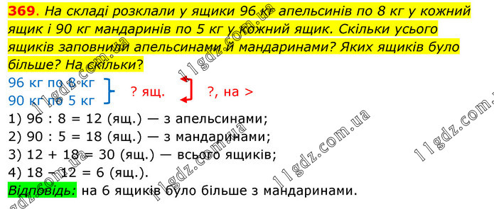 На складі розклали у ящики 96 кг апельсинів по 8 кг у кожний ящик і 90 кг мандаринів по 5 кг у кожний ящик. Скільки усього ящиків заповнили апельсинами й мандаринами? Яких ящиків було більше? На скільки? 96 кг по 8 кг 90 кг по 5 кг 1) 96 : 8 = 12 (ящ.) — з апельсинами; 2) 90 : 5 = 18 (ящ.) — з мандаринами; 3) 12 + 18 = 30 (ящ.) — всього ящиків; 4) 18 – 12 = 6 (ящ.). Відповідь: на 6 ящиків було більше з мандаринами.