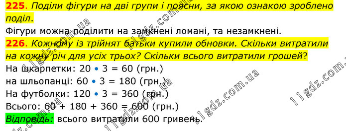 225. Поділи фігури на дві групи і поясни, за якою ознакою зроблено поділ. Фігури можна поділити на замкнені ломані, та незамкнені. 226. Кожному із трійнят батьки купили обновки. Скільки витратили на кожну річ для усіх трьох? Скільки всього витратили грошей? На шкарпетки: 20 • 3 = 60 (грн.) на шльопанці: 60 • 3 = 180 (грн.) На футболки: 120 • 3 = 360 (грн.) Всього: 60 + 180 + 360 = 600 (грн.) Відповідь: всього витратили 600 гривень.