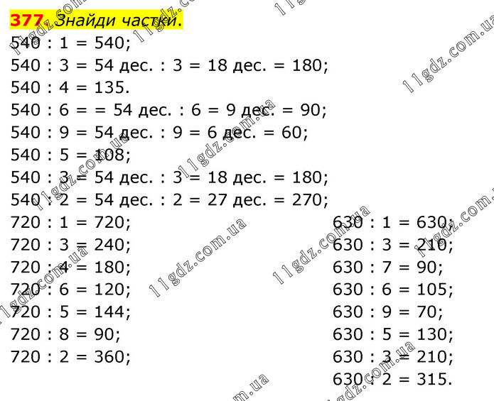 Знайди частки. 540 : 1 = 540; 540 : 3 = 54 дес. : 3 = 18 дес. = 180; 540 : 4 = 135. 540 : 6 = = 54 дес. : 6 = 9 дес. = 90; 540 : 9 = 54 дес. : 9 = 6 дес. = 60; 540 : 5 = 108; 540 : 3 = 54 дес. : 3 = 18 дес. = 180; 540 : 2 = 54 дес. : 2 = 27 дес. = 270; 720 : 1 = 720; 720 : 3 = 240; 720 : 4 = 180; 720 : 6 = 120; 720 : 5 = 144; 720 : 8 = 90; 720 : 2 = 360; 630 : 1 = 630; 630 : 3 = 210; 630 : 7 = 90; 630 : 6 = 105; 630 : 9 = 70; 630 : 5 = 130; 630 : 3 = 210; 630 : 2 = 315.