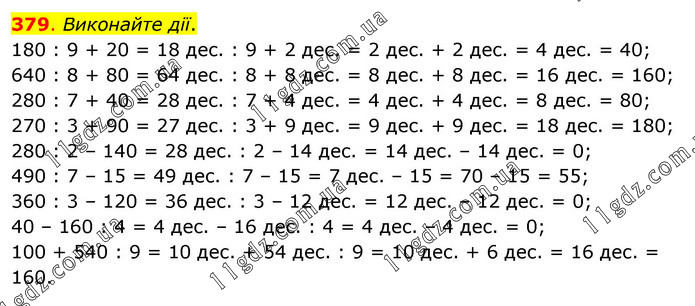 Виконайте дії. 180 : 9 + 20 = 18 дес. : 9 + 2 дес. = 2 дес. + 2 дес. = 4 дес. = 40; 640 : 8 + 80 = 64 дес. : 8 + 8 дес. = 8 дес. + 8 дес. = 16 дес. = 160; 280 : 7 + 40 = 28 дес. : 7 + 4 дес. = 4 дес. + 4 дес. = 8 дес. = 80; 270 : 3 + 90 = 27 дес. : 3 + 9 дес. = 9 дес. + 9 дес. = 18 дес. = 180; 280 : 2 – 140 = 28 дес. : 2 – 14 дес. = 14 дес. – 14 дес. = 0; 490 : 7 – 15 = 49 дес. : 7 – 15 = 7 дес. – 15 = 70 – 15 = 55; 360 : 3 – 120 = 36 дес. : 3 – 12 дес. = 12 дес. – 12 дес. = 0; 40 – 160 : 4 = 4 дес. – 16 дес. : 4 = 4 дес. – 4 дес. = 0; 100 + 540 : 9 = 10 дес. + 54 дес. : 9 = 10 дес. + 6 дес. = 16 дес. = 160.