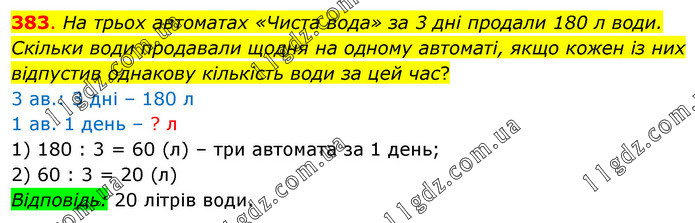 На трьох автоматах «Чиста вода» за 3 дні продали 180 л води. Скільки води продавали щодня на одному автоматі, якщо кожен із них відпустив однакову кількість води за цей час? 3 ав.: 3 дні – 180 л 1 ав. 1 день – ? л 1) 180 : 3 = 60 (л) – три автомата за 1 день; 2) 60 : 3 = 20 (л) Відповідь: 20 літрів води.