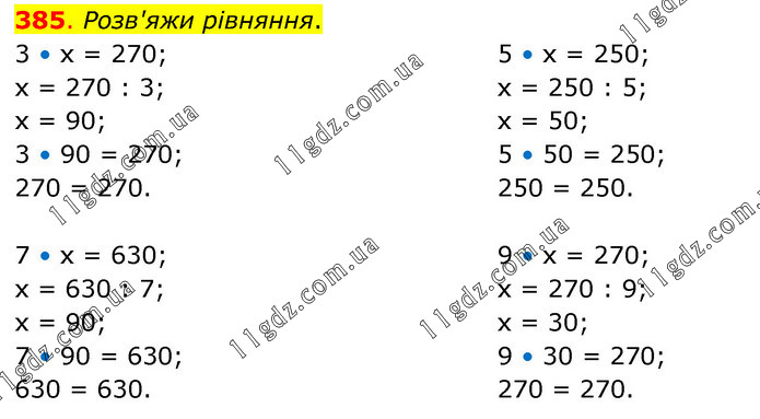 Розв'яжи рівняння. 3 • х = 270; х = 270 : 3; х = 90; 3 • 90 = 270; 270 = 270. 5 • х = 250; х = 250 : 5; х = 50; 5 • 50 = 250; 250 = 250. 7 • х = 630; х = 630 : 7; х = 90; 7 • 90 = 630; 630 = 630. 9 • х = 270; х = 270 : 9; х = 30; 9 • 30 = 270; 270 = 270.