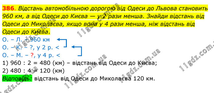 Відстань автомобільною дорогою від Одеси до Львова становить 960 км, а від Одеси до Києва — у 2 рази менша. Знайди відстань від Одеси до Миколаєва, якщо вона у 4 рази менша, ніж відстань від Одеси до Києва. О. – Л. – 960 км О. – К. – ?, у 2 р. < О. – М. – ?, у 4 р. < 1) 960 : 2 = 480 (км) – відстань від Одеси до Києва; 2) 480 : 4 = 120 (км) Відповідь: відстань від Одеси до Миколаєва 120 км.