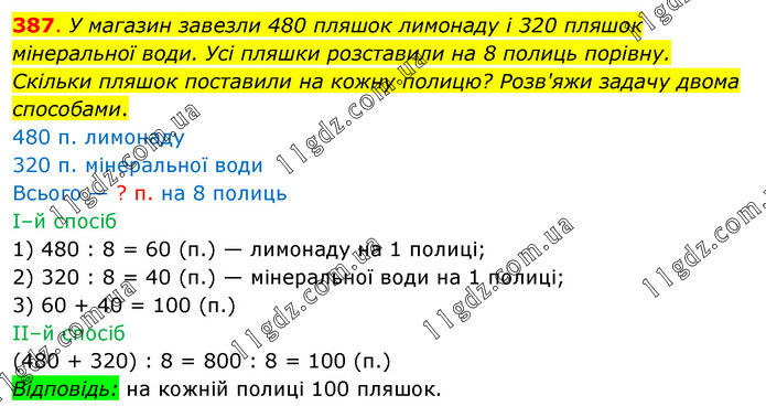 У магазин завезли 480 пляшок лимонаду і 320 пляшок мінеральної води. Усі пляшки розставили на 8 полиць порівну. Скільки пляшок поставили на кожну полицю? Розв'яжи задачу двома способами. 480 п. лимонаду 320 п. мінеральної води Всього — ? п. на 8 полиць I–й спосіб 1) 480 : 8 = 60 (п.) — лимонаду на 1 полиці; 2) 320 : 8 = 40 (п.) — мінеральної води на 1 полиці; 3) 60 + 40 = 100 (п.) II–й спосіб (480 + 320) : 8 = 800 : 8 = 100 (п.) Відповідь: на кожній полиці 100 пляшок.