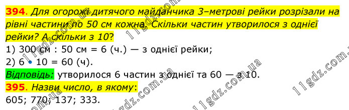 394. Для огорожі дитячого майданчика 3–метрові рейки розрізали на рівні частини по 50 см кожна. Скільки частин утворилося з однієї рейки? А скільки з 10? 1) 300 см : 50 см = 6 (ч.) — з однієї рейки; 2) 6 • 10 = 60 (ч). Відповідь: утворилося 6 частин з однієї та 60 — з 10. 395. Назви число, в якому: 605; 770; 137; 333.