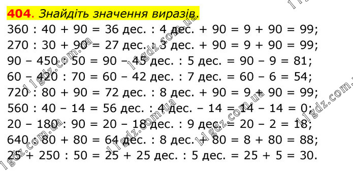 Знайдіть значення виразів. 360 : 40 + 90 = 36 дес. : 4 дес. + 90 = 9 + 90 = 99; 270 : 30 + 90 = 27 дес. : 3 дес. + 90 = 9 + 90 = 99; 90 – 450 : 50 = 90 – 45 дес. : 5 дес. = 90 – 9 = 81; 60 – 420 : 70 = 60 – 42 дес. : 7 дес. = 60 – 6 = 54; 720 : 80 + 90 = 72 дес. : 8 дес. + 90 = 9 + 90 = 99; 560 : 40 – 14 = 56 дес. : 4 дес. – 14 = 14 – 14 = 0; 20 – 180 : 90 = 20 – 18 дес. : 9 дес. = 20 – 2 = 18; 640 : 80 + 80 = 64 дес. : 8 дес. + 80 = 8 + 80 = 88; 25 + 250 : 50 = 25 + 25 дес. : 5 дес. = 25 + 5 = 30.