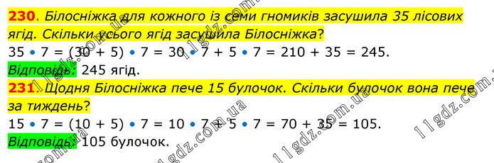 230. Білосніжка для кожного із семи гномиків засушила 35 лісових ягід. Скільки усього ягід засушила Білосніжка? 35 • 7 = (30 + 5) • 7 = 30 • 7 + 5 • 7 = 210 + 35 = 245. Відповідь: 245 ягід. 231. Щодня Білосніжка пече 15 булочок. Скільки булочок вона пече за тиждень? 15 • 7 = (10 + 5) • 7 = 10 • 7 + 5 • 7 = 70 + 35 = 105. Відповідь: 105 булочок.