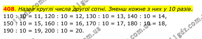 Назви круглі числа другої сотні. Зменш кожне з них у 10 разів. 110 : 10 = 11, 120 : 10 = 12, 130 : 10 = 13, 140 : 10 = 14, 150 : 10 = 15, 160 : 10 = 16, 170 : 10 = 17, 180 : 10 = 18, 190 : 10 = 19, 200 : 10 = 20.