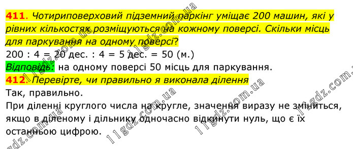 411. Чотириповерховий підземний паркінг уміщає 200 машин, які у рівних кількостях розміщуються на кожному поверсі. Скільки місць для паркування на одному поверсі? 200 : 4 = 20 дес. : 4 = 5 дес. = 50 (м.) Відповідь: на одному поверсі 50 місць для паркування. 412. Перевірте, чи правильно я виконала ділення Так, правильно. При діленні круглого числа на кругле, значення виразу не зміниться, якщо в діленому і дільнику одночасно відкинути нуль, що є їх останньою цифрою.
