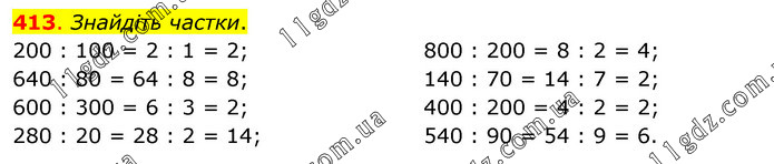 Знайдіть частки. 200 : 100 = 2 : 1 = 2; 640 : 80 = 64 : 8 = 8; 600 : 300 = 6 : 3 = 2; 280 : 20 = 28 : 2 = 14; 800 : 200 = 8 : 2 = 4; 140 : 70 = 14 : 7 = 2; 400 : 200 = 4 : 2 = 2; 540 : 90 = 54 : 9 = 6.