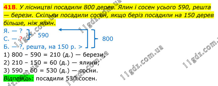 У лісництві посадили 800 дерев. Ялин і сосен усього 590, решта — берези. Скільки посадили сосен, якщо беріз посадили на 150 дерев більше, ніж ялин. Я. — ? С. — ? 800 Б. — ?, решта, на 150 р. > 1) 800 – 590 = 210 (д.) — берези; 2) 210 – 150 = 60 (д.) — ялини; 3) 590 – 60 = 530 (д.) — сосни. Відповідь: посадили 530 сосен.