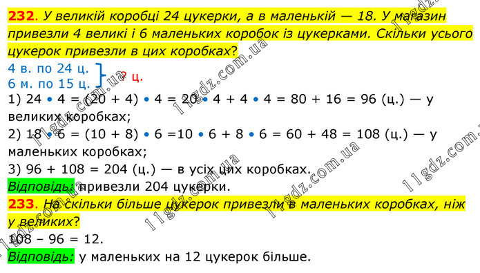 232. У великій коробці 24 цукерки, а в маленькій — 18. У магазин привезли 4 великі і 6 маленьких коробок із цукерками. Скільки усього цукерок привезли в цих коробках? 4 в. по 24 ц. 6 м. по 15 ц. 1) 24 • 4 = (20 + 4) • 4 = 20 • 4 + 4 • 4 = 80 + 16 = 96 (ц.) — у великих коробках; 2) 18 • 6 = (10 + 8) • 6 =10 • 6 + 8 • 6 = 60 + 48 = 108 (ц.) — у маленьких коробках; 3) 96 + 108 = 204 (ц.) — в усіх цих коробках. Відповідь: привезли 204 цукерки. 233. На скільки більше цукерок привезли в маленьких коробках, ніж у великих? 108 – 96 = 12. Відповідь: у маленьких на 12 цукерок більше.