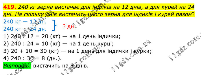 240 кг зерна вистачає для індиків на 12 днів, а для курей на 24 дні. На скільки днів вистачить цього зерна для індиків і курей разом? 240 кг — 12 дн. 240 кг — 24 дн. 1) 240 : 12 = 20 (кг) — на 1 день індички; 2) 240 : 24 = 10 (кг) — на 1 день курці; 3) 20 + 10 = 30 (кг) — на 1 день для індички і курки; 4) 240 : 30 = 8 (дн.). Відповідь: вистачить на 8 днів.