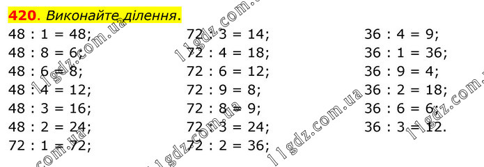 Виконайте ділення. 48 : 1 = 48; 48 : 8 = 6; 48 : 6 = 8; 48 : 4 = 12; 48 : 3 = 16; 48 : 2 = 24; 72 : 1 = 72; 72 : 3 = 14; 72 : 4 = 18; 72 : 6 = 12; 72 : 9 = 8; 72 : 8 = 9; 72 : 3 = 24; 72 : 2 = 36; 36 : 4 = 9; 36 : 1 = 36; 36 : 9 = 4; 36 : 2 = 18; 36 : 6 = 6; 36 : 3 = 12.