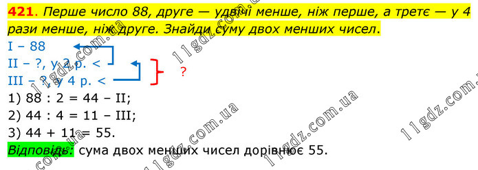 Перше число 88, друге — удвічі менше, ніж перше, а третє — у 4 рази менше, ніж друге. Знайди суму двох менших чисел. І – 88 ІІ – ?, у 2 р. < ІІІ – ?, у 4 р. < 1) 88 : 2 = 44 – ІІ; 2) 44 : 4 = 11 – ІІІ; 3) 44 + 11 = 55. Відповідь: сума двох менших чисел дорівнює 55.