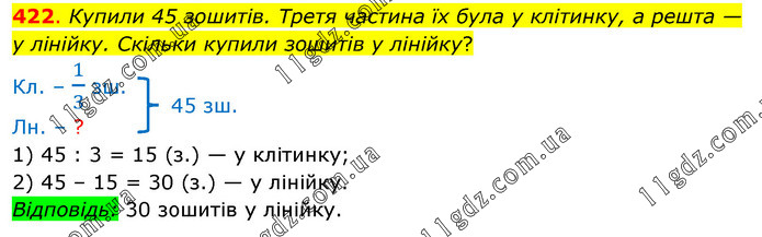 Купили 45 зошитів. Третя частина їх була у клітинку, а решта — у лінійку. Скільки купили зошитів у лінійку? Кл. – 1/3 зш. Лн. – ? 1) 45 : 3 = 15 (з.) — у клітинку; 2) 45 – 15 = 30 (з.) — у лінійку. Відповідь: 30 зошитів у лінійку.