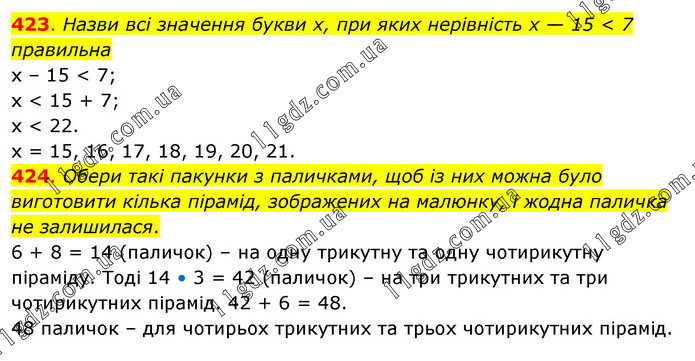 423. Назви всі значення букви х, при яких нерівність х — 15 < 7 правильна х – 15 < 7; х < 15 + 7; x < 22. х = 15, 16, 17, 18, 19, 20, 21. 424. Обери такі пакунки з паличками, щоб із них можна було виготовити кілька пірамід, зображених на малюнку, і жодна паличка не залишилася. 6 + 8 = 14 (паличок) – на одну трикутну та одну чотирикутну піраміду. Тоді 14 • 3 = 42 (паличок) – на три трикутних та три чотирикутних пірамід. 42 + 6 = 48. 48 паличок – для чотирьох трикутних та трьох чотирикутних пірамід.