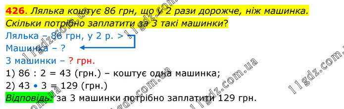 Лялька коштує 86 грн, що у 2 рази дорожче, ніж машинка. Скільки потрібно заплатити за 3 такі машинки? Лялька – 86 грн, у 2 р. > Машинка – ? 3 машинки – ? грн. 1) 86 : 2 = 43 (грн.) – коштує одна машинка; 2) 43 • 3 = 129 (грн.) Відповідь: за 3 машинки потрібно заплатити 129 грн.