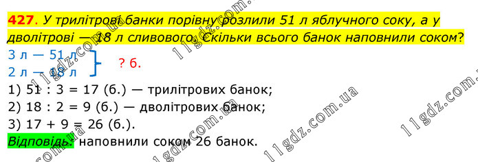 У трилітрові банки порівну розлили 51 л яблучного соку, а у дволітрові — 18 л сливового. Скільки всього банок наповнили соком? 3 л — 51 л 2 л — 18 л 1) 51 : 3 = 17 (б.) — трилітрових банок; 2) 18 : 2 = 9 (б.) — дволітрових банок; 3) 17 + 9 = 26 (б.). Відповідь: наповнили соком 26 банок.