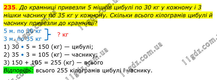 До крамниці привезли 5 мішків цибулі по 30 кг у кожному і 3 мішки часнику по 35 кг у кожному. Скільки всього кілограмів цибулі й часнику привезли до крамниці? 5 м. по 30 кг 3 м. по 35 кг 1) 30 • 5 = 150 (кг) — цибулі; 2) 35 • 3 = 105 (кг) — часнику; 3) 150 + 105 = 255 (кг) — всього Відповідь: всього 255 кілограмів цибулі і часнику.