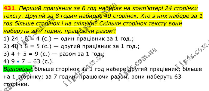 Перший працівник за 6 год набирає на комп'ютері 24 сторінки тексту. Другий за 8 годин набирає 40 сторінок. Хто з них набере за 1 год більше сторінок і на скільки? Скільки сторінок тексту вони наберуть за 7 годин, працюючи разом? 1) 24 : 6 = 4 (с.) — один працівник за 1 год.; 2) 40 : 8 = 5 (с.) — другий працівник за 1 год.; 3) 4 + 5 = 9 (с.) — разом за 1 год.; 4) 9 • 7 = 63 (с.). Відповідь: більше сторінок за 1 год набере другий працівник; більше на 1 сторінку; за 7 годин, працюючи разом, вони наберуть 63 сторінки.