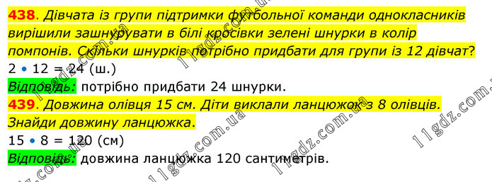438. Дівчата із групи підтримки футбольної команди однокласників вирішили зашнурувати в білі кросівки зелені шнурки в колір помпонів. Скільки шнурків потрібно придбати для групи із 12 дівчат? 2 • 12 = 24 (ш.) Відповідь: потрібно придбати 24 шнурки. 439. Довжина олівця 15 см. Діти виклали ланцюжок з 8 олівців. Знайди довжину ланцюжка. 15 • 8 = 120 (см) Відповідь: довжина ланцюжка 120 сантиметрів.