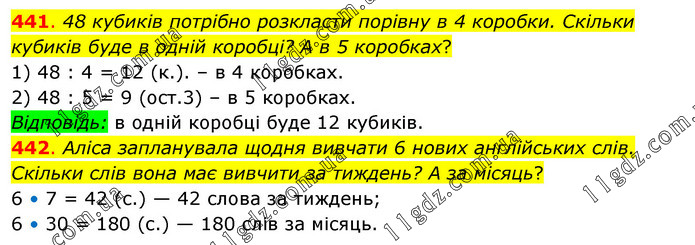 441. 48 кубиків потрібно розкласти порівну в 4 коробки. Скільки кубиків буде в одній коробці? А в 5 коробках? 1) 48 : 4 = 12 (к.). – в 4 коробках. 2) 48 : 5 = 9 (ост.3) – в 5 коробках. Відповідь: в одній коробці буде 12 кубиків. 442. Аліса запланувала щодня вивчати 6 нових англійських слів. Скільки слів вона має вивчити за тиждень? А за місяць? 6 • 7 = 42 (с.) — 42 слова за тиждень; 6 • 30 = 180 (с.) — 180 слів за місяць.