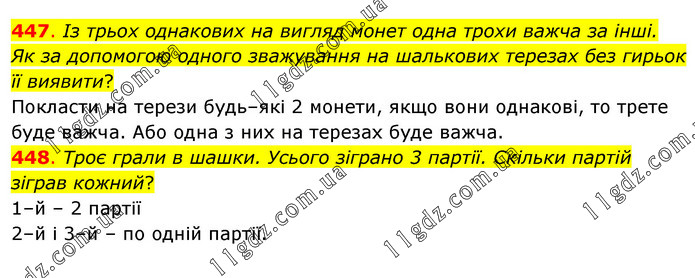 447. Із трьох однакових на вигляд монет одна трохи важча за інші. Як за допомогою одного зважування на шалькових терезах без гирьок її виявити? Покласти на терези будь–які 2 монети, якщо вони однакові, то трете буде важча. Або одна з них на терезах буде важча. 448. Троє грали в шашки. Усього зіграно 3 партії. Скільки партій зіграв кожний? 1–й – 2 партії 2–й і 3–й – по одній партії.