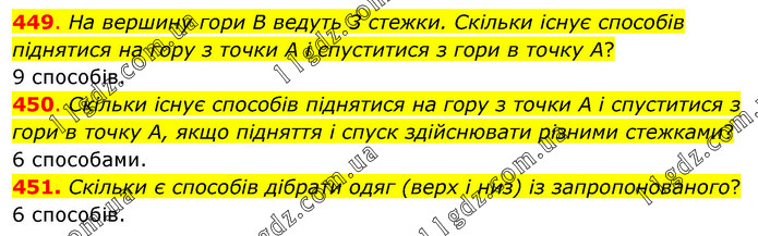 449. На вершину гори В ведуть 3 стежки. Скільки існує способів піднятися на гору з точки А і спуститися з гори в точку А? 9 способів. 450. Скільки існує способів піднятися на гору з точки А і спуститися з гори в точку А, якщо підняття і спуск здійснювати різними стежками? 6 способами. 451. Скільки є способів дібрати одяг (верх і низ) із запропонованого? 6 способів.
