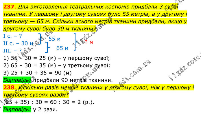 237. Для виготовлення театральних костюмів придбали 3 сувої тканини. У першому і другому сувоях було 55 метрів, а у другому і третьому — 65 м. Скільки всього метрів тканини придбали, якщо у другому сувої було 30 м тканини? І с. – ? ІІ с. – 30 м ІІІ. – ? 1) 55 – 30 = 25 (м) – у першому сувої; 2) 65 – 30 = 35 (м) – у третьому сувої; 3) 25 + 30 + 35 = 90 (м) Відповідь: придбали 90 метрів тканини. 238. У скільки разів менше тканини у другому сувої, ніж у першому і третьому сувоях разом? (25 + 35) : 30 = 60 : 30 = 2 (р.). Відповідь: у 2 рази.
