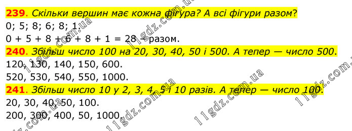 239. Скільки вершин має кожна фігура? А всі фігури разом? 0; 5; 8; 6; 8; 1. 0 + 5 + 8 + 6 + 8 + 1 = 28 – разом. 240. Збільш число 100 на 20, 30, 40, 50 і 500. А тепер — число 500. 120, 130, 140, 150, 600. 520, 530, 540, 550, 1000. 241. Збільш число 10 у 2, 3, 4, 5 і 10 разів. А тепер — число 100. 20, 30, 40, 50, 100. 200, 300, 400, 50, 1000.
