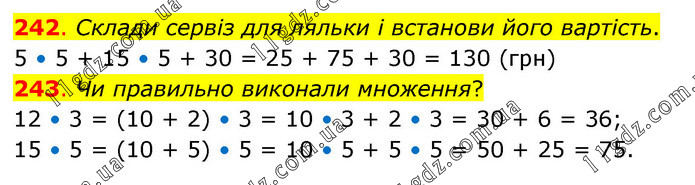 242. Склади сервіз для ляльки і встанови його вартість. 5 • 5 + 15 • 5 + 30 = 25 + 75 + 30 = 130 (грн) 243. Чи правильно виконали множення? 12 • 3 = (10 + 2) • 3 = 10 • 3 + 2 • 3 = 30 + 6 = 36; 15 • 5 = (10 + 5) • 5 = 10 • 5 + 5 • 5 = 50 + 25 = 75.