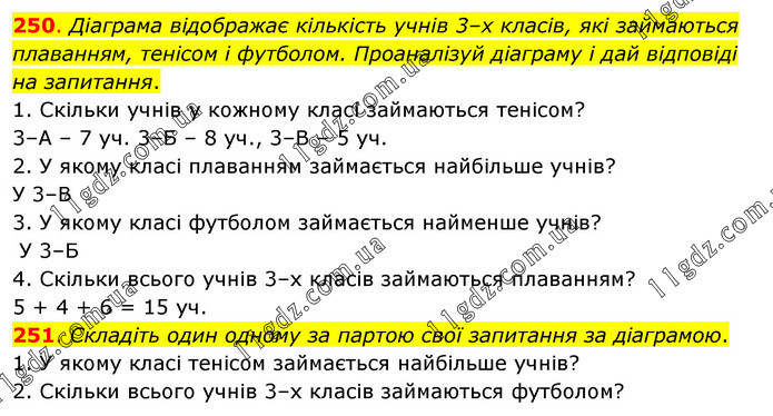 250. Діаграма відображає кількість учнів 3–х класів, які займаються плаванням, тенісом і футболом. Проаналізуй діаграму і дай відповіді на запитання. 1. Скільки учнів у кожному класі займаються тенісом? 3–А – 7 уч. 3–Б – 8 уч., 3–В – 5 уч. 2. У якому класі плаванням займається найбільше учнів? У 3–В 3. У якому класі футболом займається найменше учнів? У 3–Б 4. Скільки всього учнів 3–х класів займаються плаванням? 5 + 4 + 6 = 15 уч. 251. Складіть один одному за партою свої запитання за діаграмою. 1. У якому класі тенісом займається найбільше учнів? 2. Скільки всього учнів 3–х класів займаються футболом?