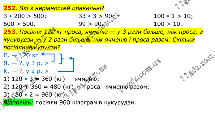252. Які з нерівностей правильні? 3 • 200 > 500; 600 > 500. 33 • 3 > 90; 99 > 90. 100 • 1 > 10; 100 > 10. 253. Посіяли 120 кг проса, ячменю — у 3 рази більше, ніж проса, а кукурудзи — у 2 рази більше, ніж ячменю і проса разом. Скільки посіяли кукурудзи? П. — 120 кг Я. — ?, у 3 р. > К. — ?, у 2 р. > 1) 120 • 3 = 360 (кг) — ячменю; 2) 120 + 360 = 480 (кг) — проса і ячменю разом; 3) 480 • 2 = 960 (кг). Відповідь: посіяли 960 кілограмів кукурудзи.