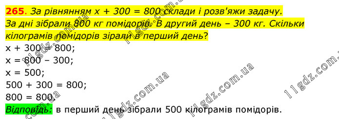 За рівнянням х + 300 = 800 склади і розв'яжи задачу. За дні зібрали 800 кг помідорів. В другий день – 300 кг. Скільки кілограмів помідорів зірали в перший день? х + 300 = 800; х = 800 – 300; х = 500; 500 + 300 = 800; 800 = 800. Відповідь: в перший день зібрали 500 кілограмів помідорів.