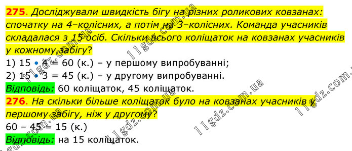 275. Досліджували швидкість бігу на різних роликових ковзанах: спочатку на 4–колісних, а потім на 3–колісних. Команда учасників складалася з 15 осіб. Скільки всього коліщаток на ковзанах учасників у кожному забігу? 1) 15 • 4 = 60 (к.) – у першому випробуванні; 2) 15 • 3 = 45 (к.) – у другому випробуванні. Відповідь: 60 коліщаток, 45 коліщаток. 276. На скільки більше коліщаток було на ковзанах учасників у першому забігу, ніж у другому? 60 – 45 = 15 (к.) Відповідь: на 15 коліщаток.