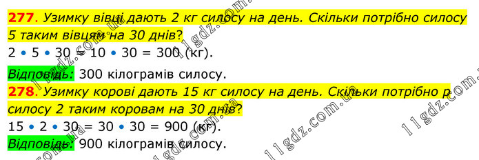 277. Узимку вівці дають 2 кг силосу на день. Скільки потрібно силосу 5 таким вівцям на 30 днів? 2 • 5 • 30 = 10 • 30 = 300 (кг). Відповідь: 300 кілограмів силосу. 278. Узимку корові дають 15 кг силосу на день. Скільки потрібно р силосу 2 таким коровам на 30 днів? 15 • 2 • 30 = 30 • 30 = 900 (кг). Відповідь: 900 кілограмів силосу.