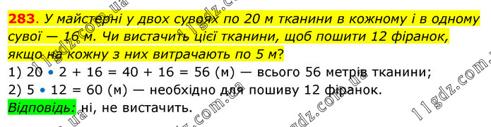 У майстерні у двох сувоях по 20 м тканини в кожному і в одному сувої — 16 м. Чи вистачить цієї тканини, щоб пошити 12 фіранок, якщо на кожну з них витрачають по 5 м? 1) 20 • 2 + 16 = 40 + 16 = 56 (м) — всього 56 метрів тканини; 2) 5 • 12 = 60 (м) — необхідно для пошиву 12 фіранок. Відповідь: ні, не вистачить.