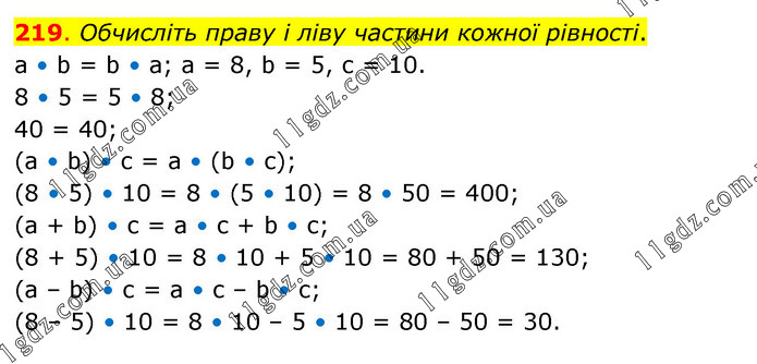 Обчисліть праву і ліву частини кожної рівності. а • b = b • а; а = 8, b = 5, с = 10. 8 • 5 = 5 • 8; 40 = 40; (а • b) • с = а • (b • с); (8 • 5) • 10 = 8 • (5 • 10) = 8 • 50 = 400; (а + b) • с = а • с + b • с; (8 + 5) • 10 = 8 • 10 + 5 • 10 = 80 + 50 = 130; (а – b) • с = а • с – b • с; (8 – 5) • 10 = 8 • 10 – 5 • 10 = 80 – 50 = 30.