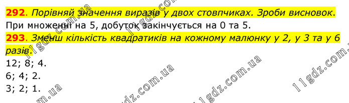 292. Порівняй значення виразів у двох стовпчиках. Зроби висновок. При множенні на 5, добуток закінчується на 0 та 5. 293. Зменш кількість квадратиків на кожному малюнку у 2, у 3 та у 6 разів. 12; 8; 4. 6; 4; 2. 3; 2; 1.