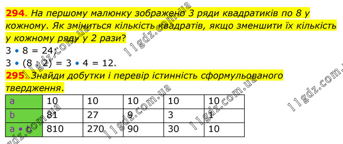 294. На першому малюнку зображено 3 ряди квадратиків по 8 у кожному. Як зміниться кількість квадратів, якщо зменшити їх кількість у кожному ряду у 2 рази? 3 • 8 = 24; 3 • (8 : 2) = 3 • 4 = 12. 295. Знайди добутки і перевір істинність сформульованого твердження.