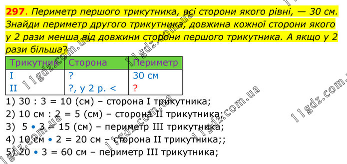 Периметр першого трикутника, всі сторони якого рівні, — 30 см. Знайди периметр другого трикутника, довжина кожної сторони якого у 2 рази менша від довжини сторони першого трикутника. А якщо у 2 рази більша? 1) 30 : 3 = 10 (см) – сторона І трикутника; 2) 10 см : 2 = 5 (см) – сторона ІІ трикутника; 3) 5 • 3 = 15 (см) – периметр ІІІ трикутника; 4) 10 см • 2 = 20 см – сторона ІІ трикутника;; 5) 20 • 3 = 60 см – периметр ІІІ трикутника;