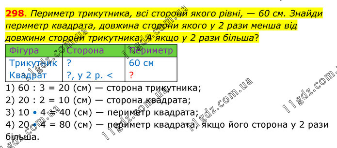 Периметр трикутника, всі сторони якого рівні, — 60 см. Знайди периметр квадрата, довжина сторони якого у 2 рази менша від довжини сторони трикутника. А якщо у 2 рази більша? 1) 60 : 3 = 20 (см) — сторона трикутника; 2) 20 : 2 = 10 (см) — сторона квадрата; 3) 10 • 4 = 40 (см) — периметр квадрата; 4) 20 • 4 = 80 (см) — периметр квадрата, якщо його сторона у 2 рази більша.