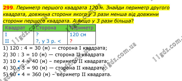 Периметр першого квадрата 120 м. Знайди периметр другого квадрата, довжина сторони якого у 3 рази менша від довжини сторони першого квадрата. А якщо у 3 рази більша? 1) 120 : 4 = 30 (м) — сторона І квадрата; 2) 30 : 3 = 10 (м) — сторона ІІ квадрата 3) 10 • 4 = 40 (м) – периметр ІІ квадрата; 4) 30 • 3 = 90 (м) — сторона ІІ квадрата; 5) 90 • 4 = 360 (м) – периметр ІІ квадрата.